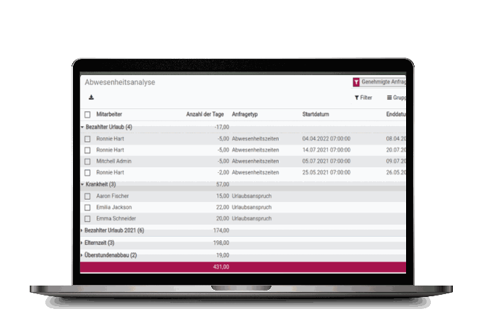 Absences filtered by type (e.g., Sick Leave, Paid Vacation)